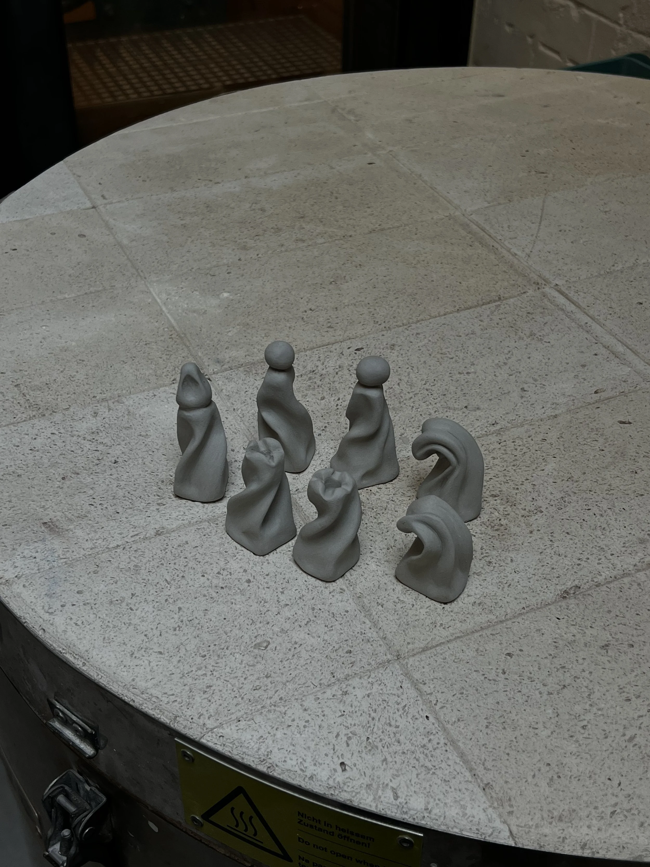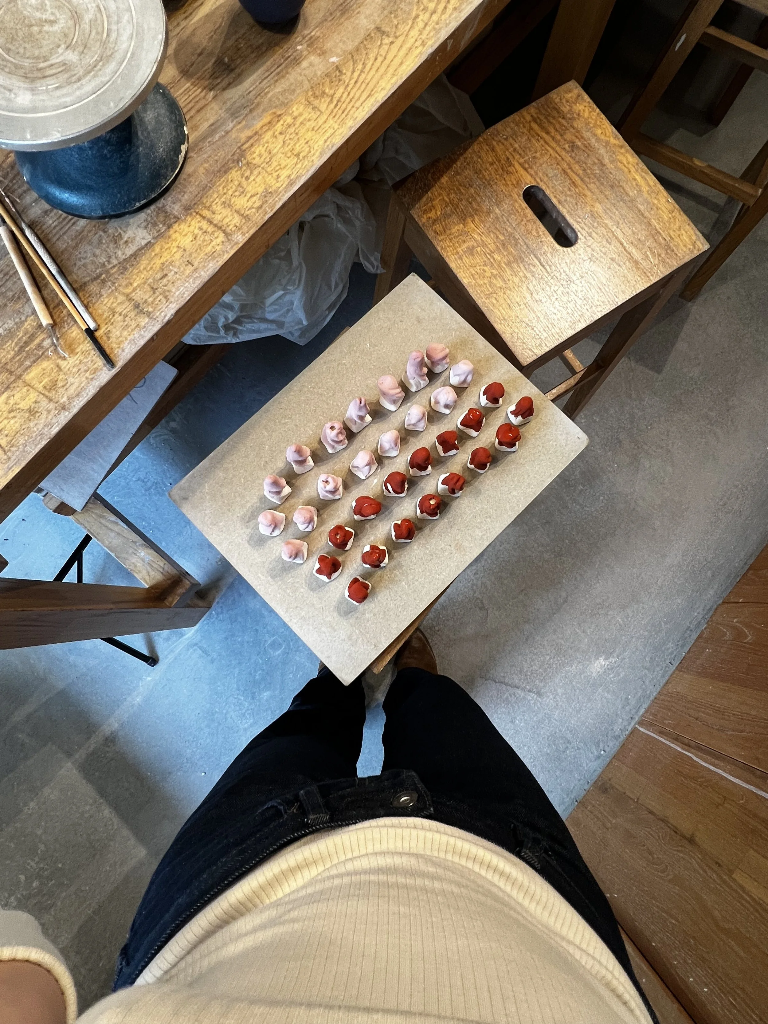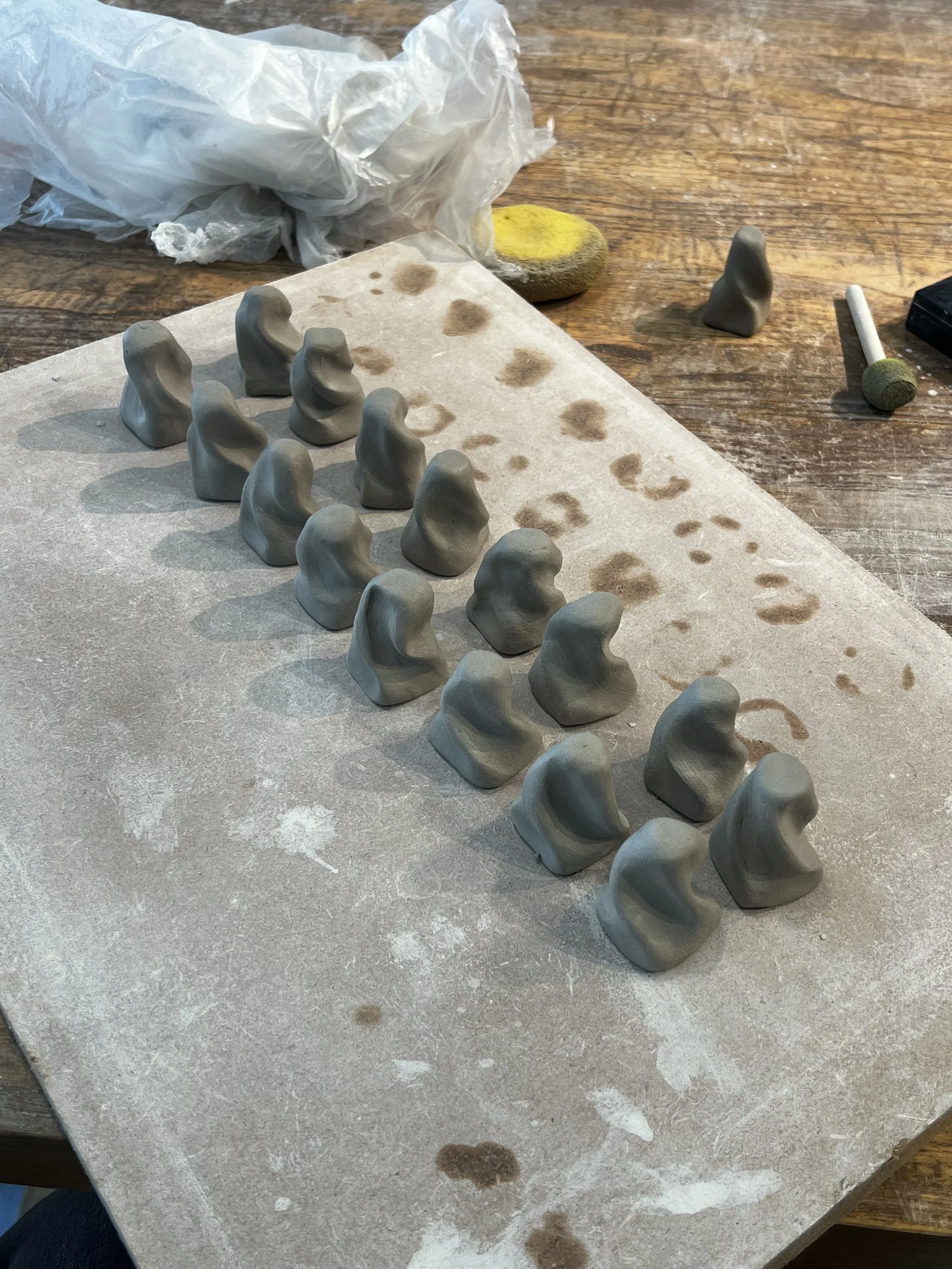The pieces are first roughly shaped from equal lumps of clay. After drying overnight, each one is individually hand-carved to reveal its unique, final form.
