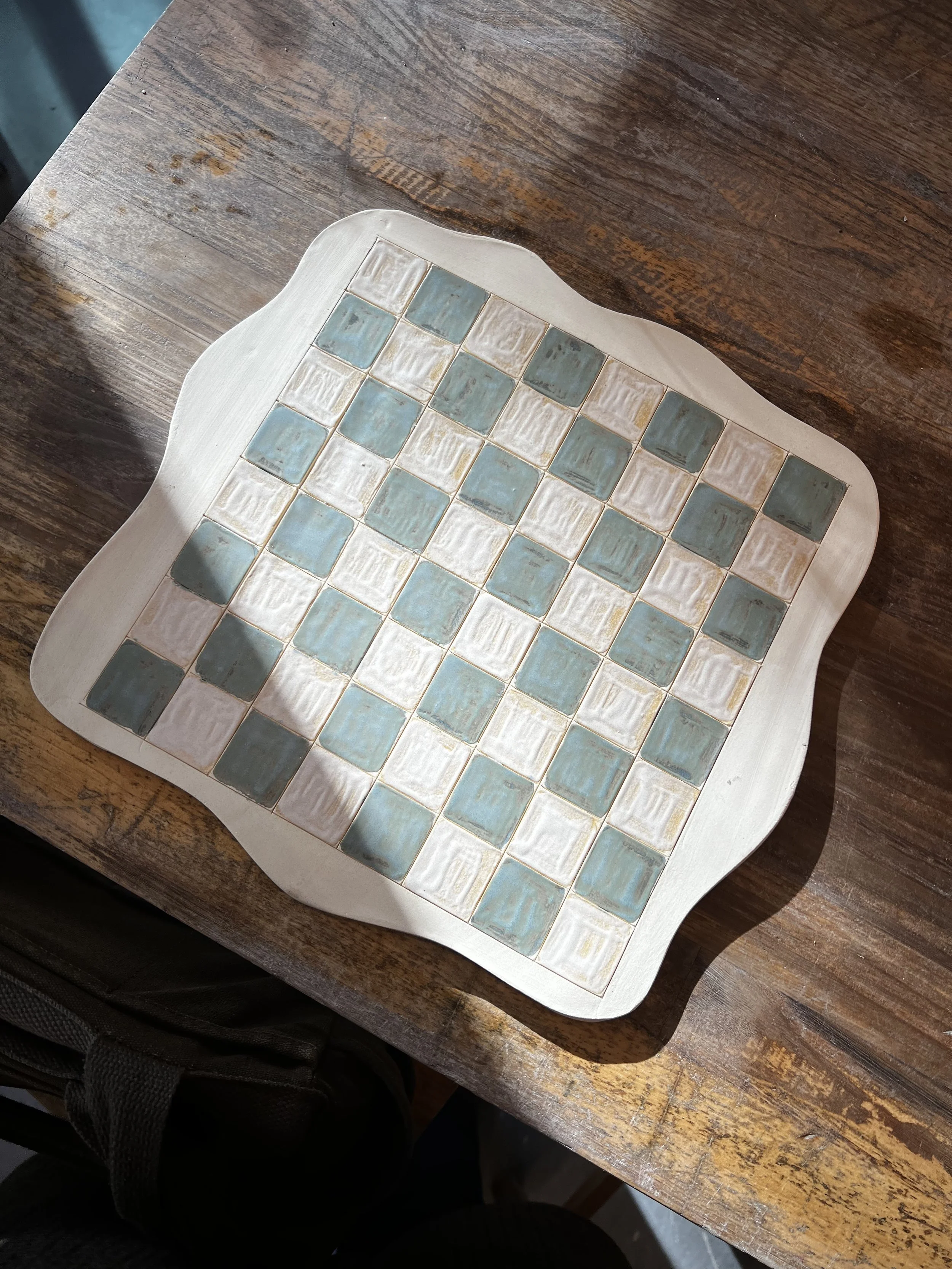 The board is made from a slab of clay, rolled out by hand, of about 28cmx28cm.